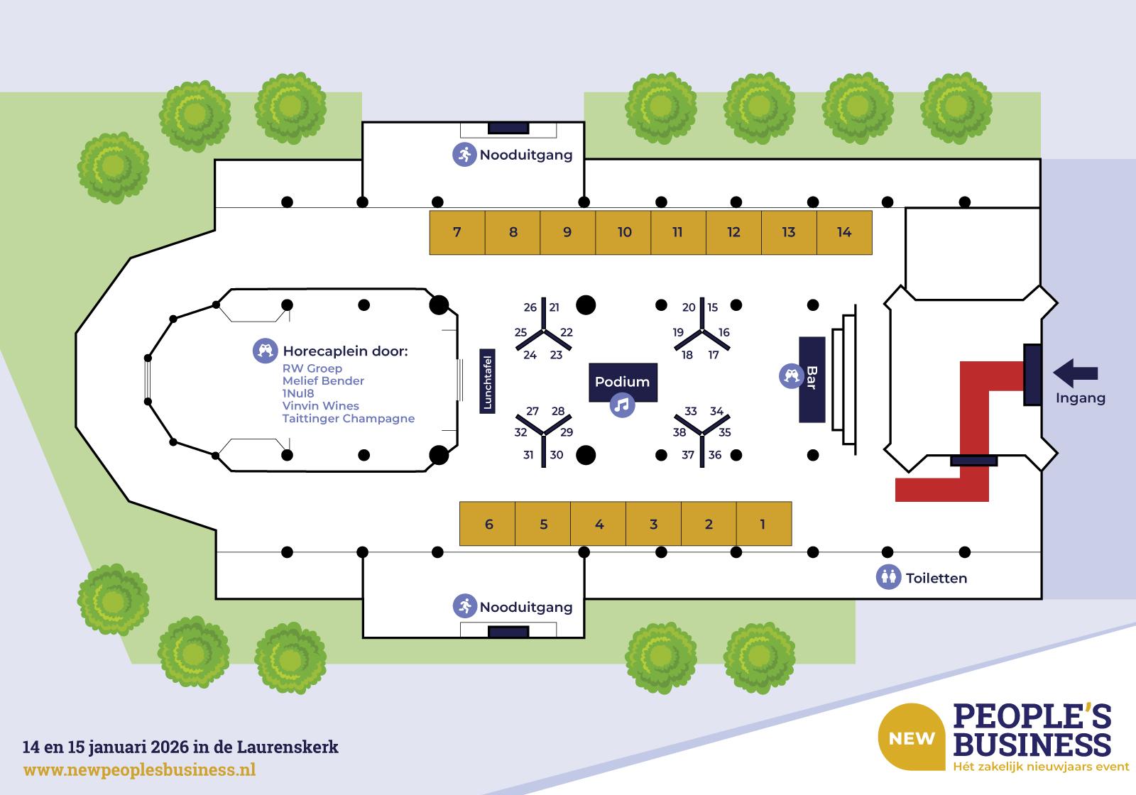 Via onderstaande knop kunt u de plattegrond van New People's Business 2026 bekijken. De plattegrond is een voorlopige indeling en onder voorbehoud van wijzigingen.